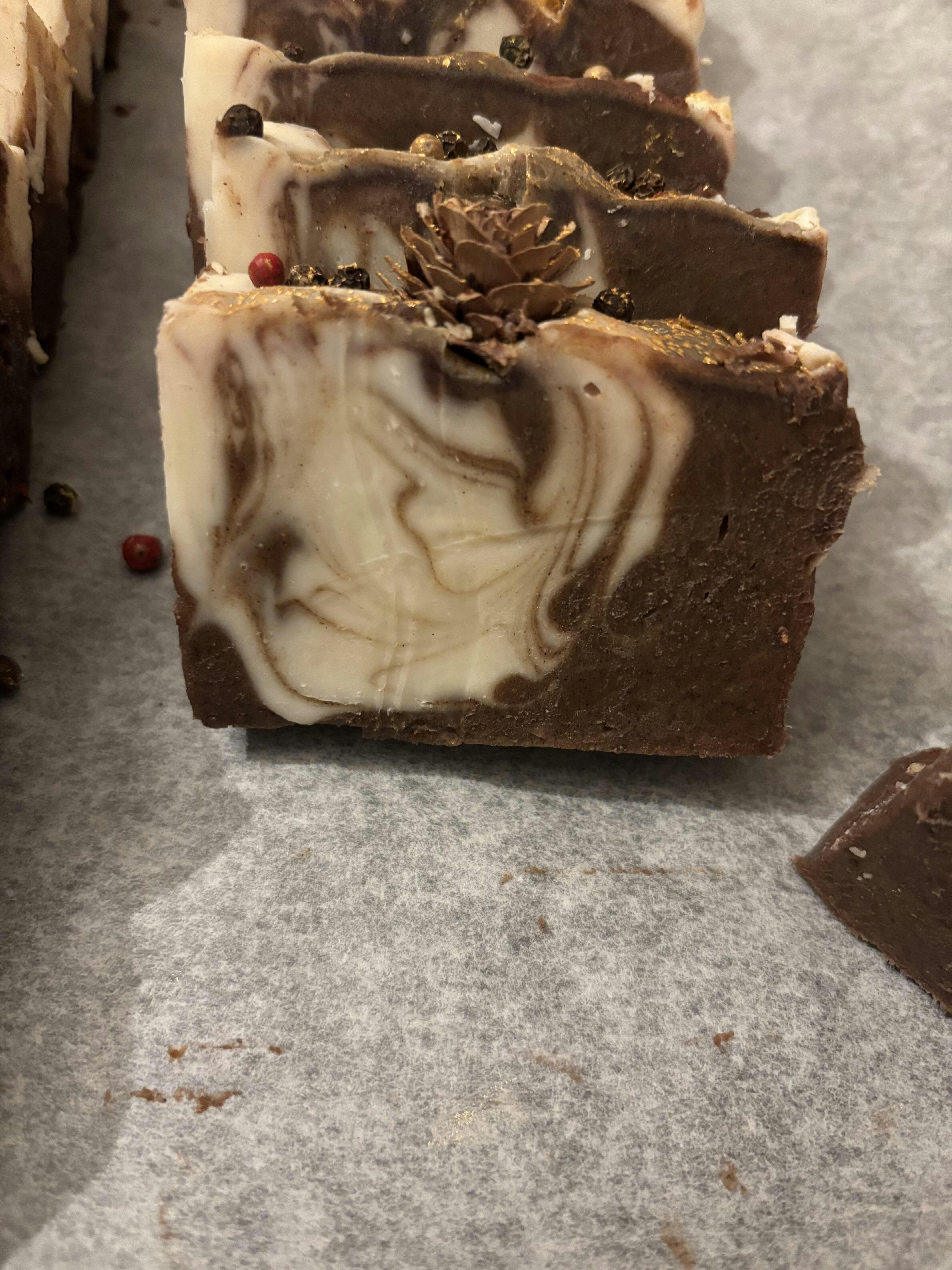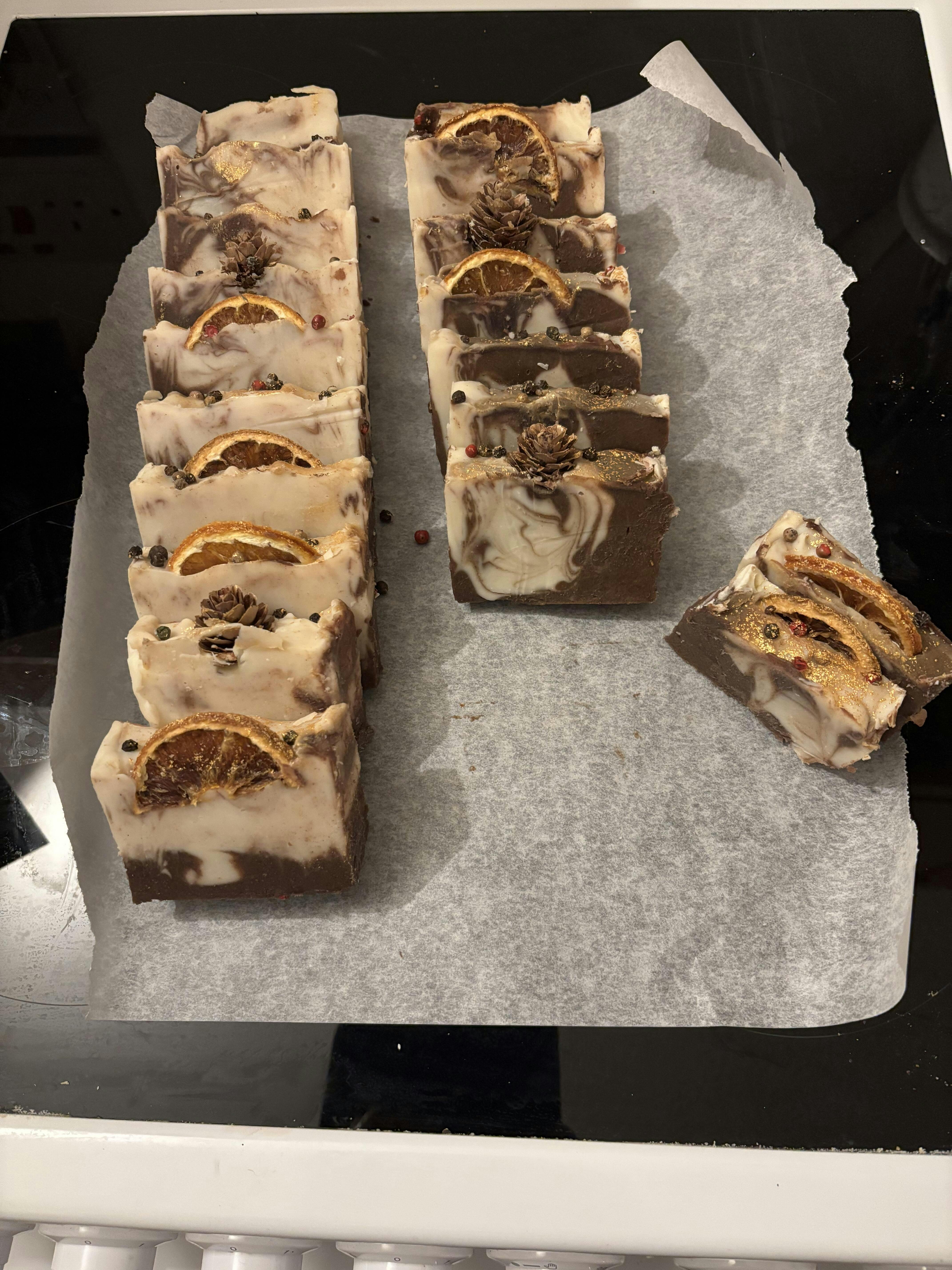 Once your soap is poured, you’ll finish it with festive botanicals such as dried orange slices, star anise, and colourful peppercorns, ready to cure in time for Christmas gifting.